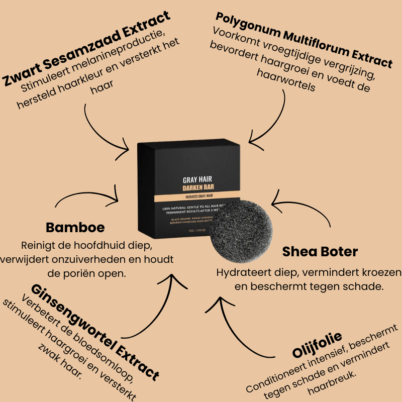 Schwarzer Sesamextrakt, Ginsengwurzelextrakt, Aktivkohlepulver, Sheabutter, Olivenöl, Polygonum multiflorum-Extrakt