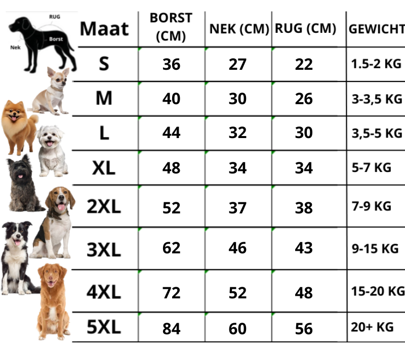 LET OP: Meet volgens de afmetingen in de Maat Tabel om de juiste pasvorm voor jouw hond te krijgen.