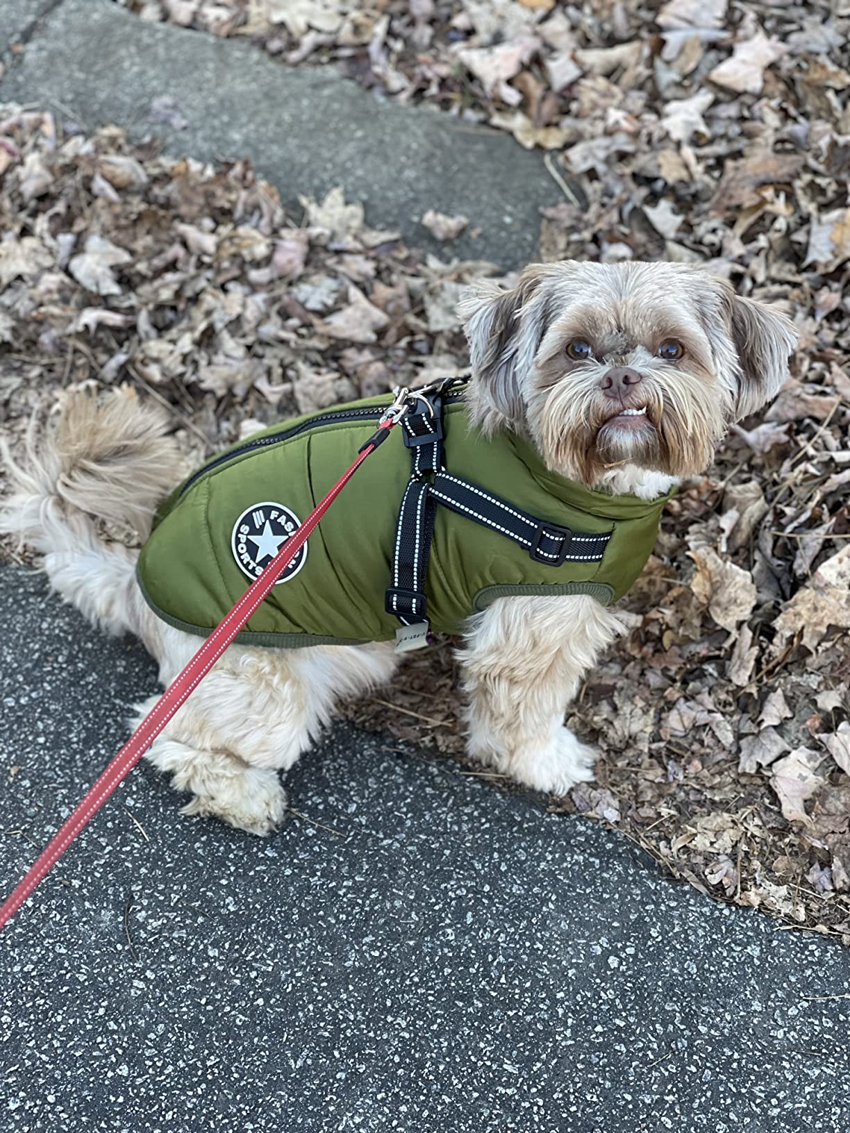 De Dog Jacket biedt niet alleen warmte, maar ook een ingebouwd tuigje. Geen aparte halsband nodig! Het geïntegreerde harnas zorgt voor veilige en comfortabele controle tijdens het lopen. Ideaal en stijlvol voor de winter!