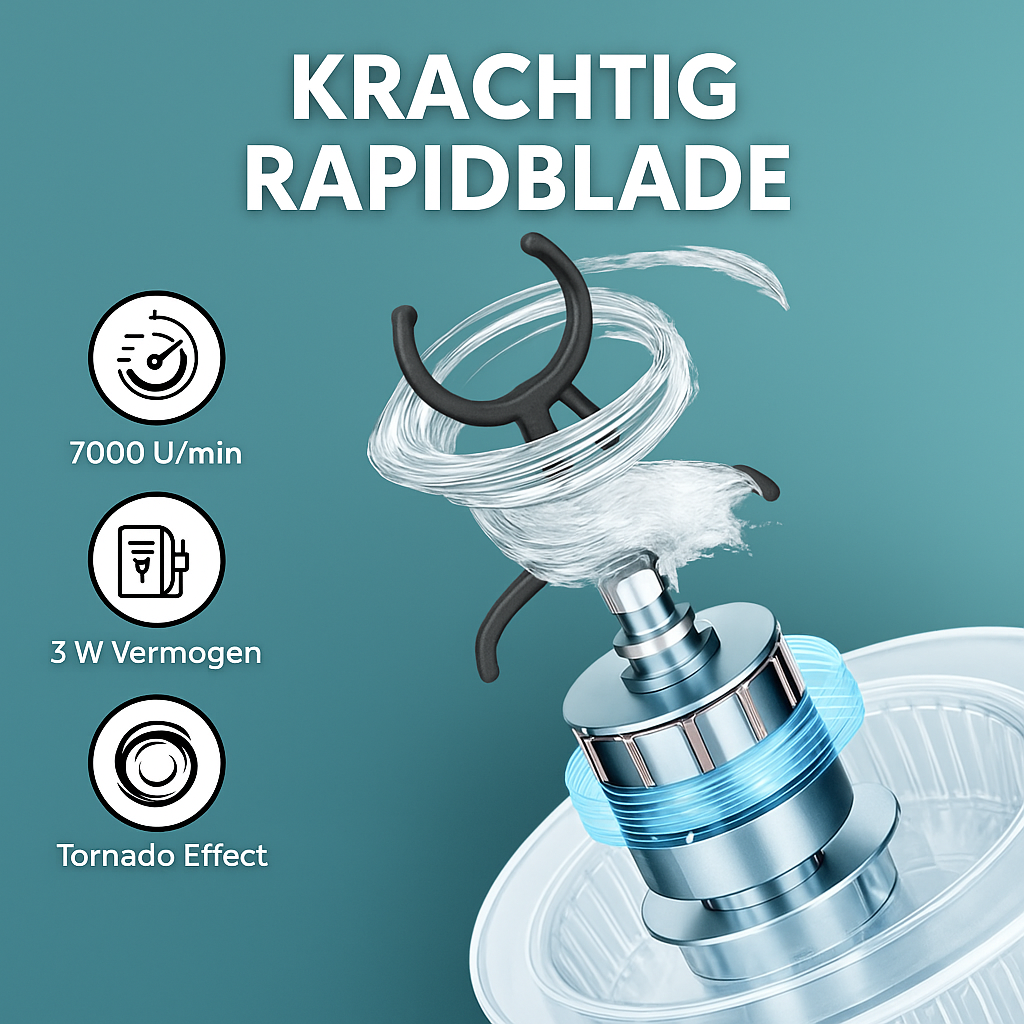 De ingebouwde high-speed motor genereert een krachtige 7.000 toeren per minuut en zorgt voor een perfect romige consistentie. Om te starten, houdt u de knop ongeveer 2 seconden ingedrukt.